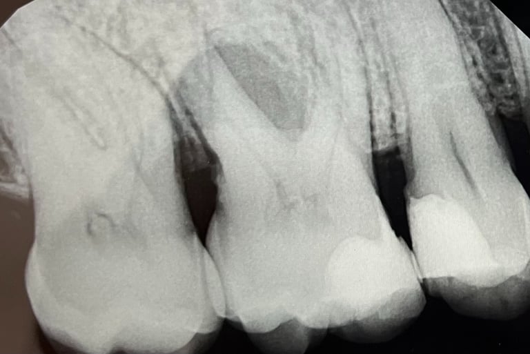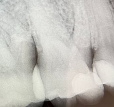 Il primo premolare superiore destro presenta una grave perdita ossea, visibile come un’area grigio scuro lungo il lato destro della radice. Le opzioni di trattamento consistono nel trattamento parodontale o estrazione del dente. A un anno dal trattamento rigenerativo parodontale, si osserva un netto miglioramento della situazione, con un evidente riempimento osseo attorno alla radice nella zona precedentemente compromessa.